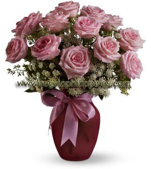 A vision of sheer loveliness, this exquisite arrangement of 12ps Lavender roses and Queen Anne's lace in a rose-colored vase is a gift that will be long remembered.