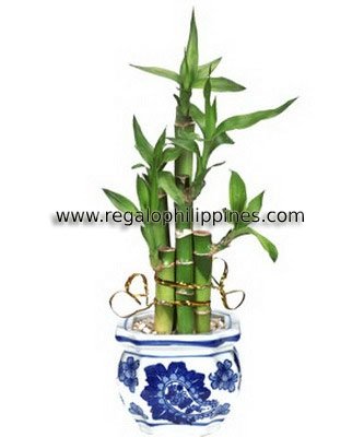 In China , Lucky Bamboo is thought to bring good fortune. This unique plant is very elegant and extrememly easy to grow. To display your lucky bamboo, simply secure the canes in the decorative rock (included) and fill the container with water. The water should be replaced routinely. Lucky Bamboo will thrive in all light conditions.