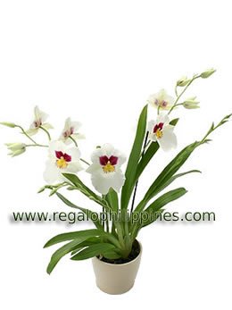 This Miltonia has a bright, white flower with a purple and yellow heart. Since the Miltonia's flowers resembles a violet, it is also known as Violet Orchid. The country of origin is Colombia . It grows there on the river banks.