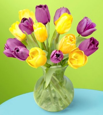 Vibrant fresh cut tulips in a vase will make a cheery display wherever they are displayed . We have selected 12 stem of lavender and yellow to make a cheerful spring .