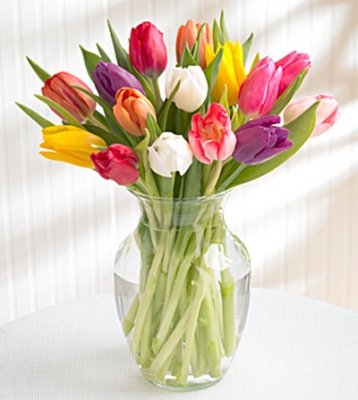 Vibrant fresh cut tulips will make a cheery showing wherever they are displayed. We have selected 15 stems in a variety of mixed colors. This bouquet is perfect for any occasion. Flower colors will vary to fit the season and ensure the freshest blooms are delivered. You can choose to include a glass vase with the bouquet.
