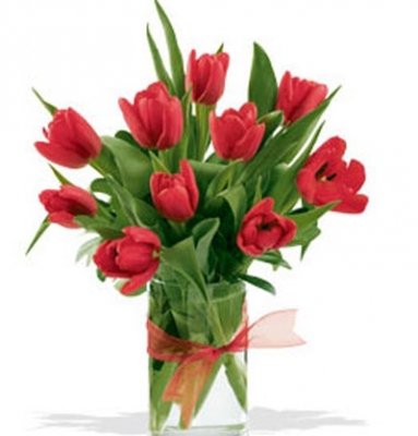 10 stems of exclusive red tulips in clear glass vase. Glass vase may vary.