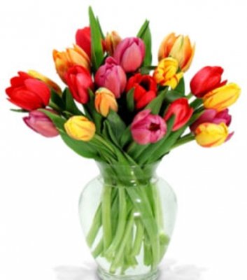 15 stem of assorted tulips (red, yellow and pink) in a clear glass vase.