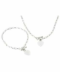 These sterling silver pieces feature single link chains accented with polished heart tags that dangle from toggle clasps. The necklace measures 18 inches in length and the bracelet measures 7 inches in length.
