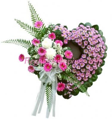 This magnificent wreath offers a heartfelt expression of sympathy. Heart-shaped wreath is composed of lavender Malaysian mums along with pink gerberas.