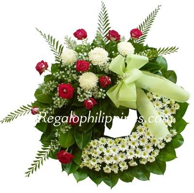Express your heartfelt sympathy and caring with this tasteful design of velvety red roses and white flower amid a field of emerald greens.