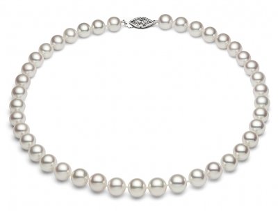 This gorgeous white freshwater pearl necklace makes an impressive gift for her. These pearls are round, with brilliant luster, captivating shine, and clean surface. The necklace is strung on silk and knotted between each pearl.