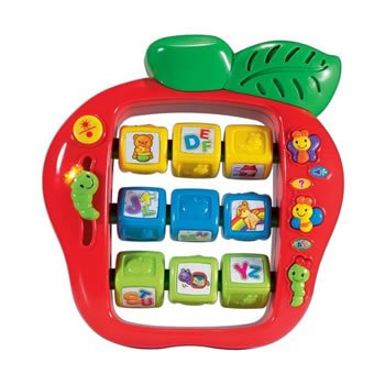 “A” is for apple. From the alphabet to baby’s first words, this toy helps build your young learner’s new vocabulary with bright spinning blocks and cute bug buttons. The sliding caterpillar starts the Alphabet Song, encouraging baby to spin the blocks and learn to sing along.