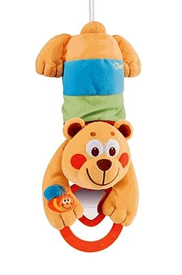 A soft musical crib toy with an “accordion effect”. A sweet melody is activated by pulling down on the colorful handle held by the bear. Baby has fun with the small heart shaped mirror and the soft bee has wings that make crinkling sounds. Can be attached just about anywhere, at home or on the go.