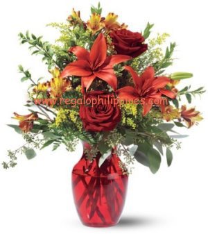 When no single flower will do, this floral arrangement expresses your thoughts with a garden of blooms: roses for love, lilies for prosperity andalstroemeria for friendship.