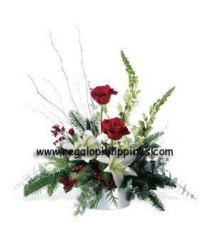 Red roses, white Asiatic lilies and snapdragons accented with noble fir, ming fern, salal, flat cedar, incense cedar and decorated with faux red berries - plus silver-glittered branches and faux eucalyptus - is delivered in a silvery centerpiece bowl.
