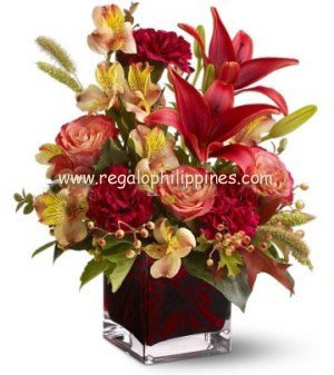 As bright and intense as a hot Indian summer afternoon, this deep red, orange and burgundy bouquet - complemented by autumn-hued oak leaves and feathery millet - is arranged in a This deep red, orange and burgundy bouquet - complemented by autumn-hued oak leaves and feathery millet - Who wouldn't love to receive such a gift? Orange roses and red Asiatic lilies, burgundy carnations, huckleberry and berries - are arranged in a glass vase.