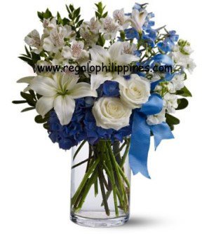 � A mix of fresh blue and white flowers such as delphinium, roses, Asiatic lilies and hydrangea is accented with greenery and a blue ribbon, and delivered in a tall glass cylinder vase.