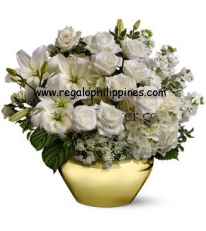 � A mix of fresh white flowers such as roses, hydrangea, Asiatic lilies and stock - accented with green leaves - is delivered in a gold-toned jardiniere.