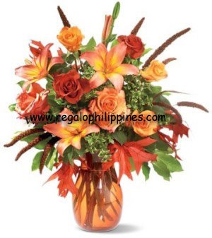 � An orange glass teardrop vase, filled with orange Asiatic lilies, bi-color peach roses, orange roses, brick-colored roses, accented with salal, oregonia and autumn leaves.