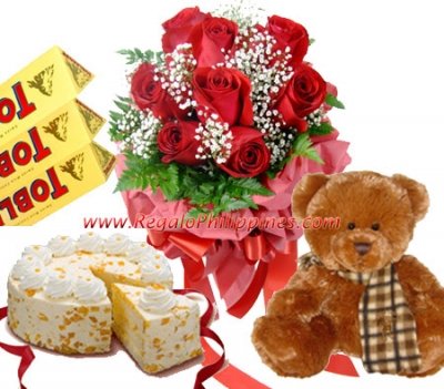 A One Dozen of Red roses beautifully arrange in a bouquet with a combination of brown cutie bear!!!!50 grams each of toblerone and a red ribbon cake best for any occasion..