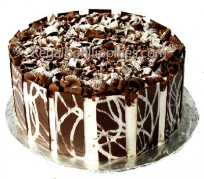 A chocolate cake with just the right sweetness Chocolate chiffon cake on a meringue wafer base covered with whipped cream and decorated with chocolate shaving and fences.