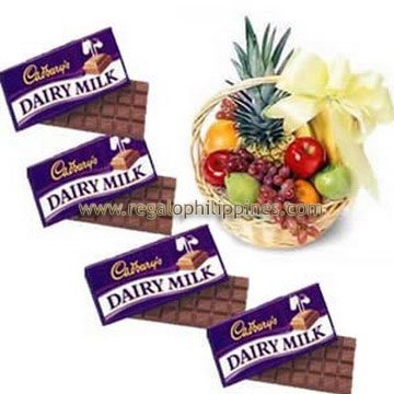 A handled wicker basket is filled with the day's freshest fruits and finished with an eye catching ribbon. Also included four premium Cad Burry Chocolate bar.