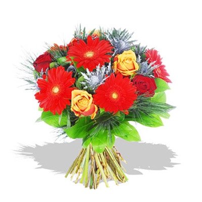 This is a delightful and heady splash of color to brighten up your room and lighten your day. This arrangement is a lovely mix of the modern bright red gerbera and traditional rose, with sparkly silver thistles for a festive summer note.