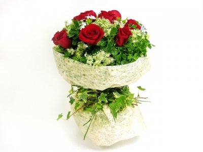 Bouquet of 12 red roses matching flowers and greens. Special wrapping to make her dreams come true.