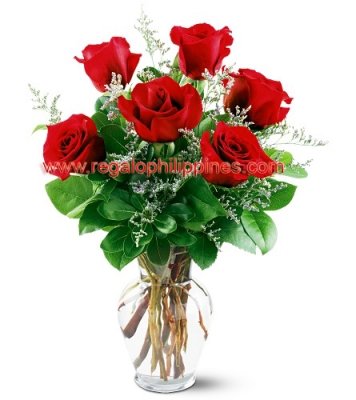 Express your love with an elegant bouquet of six beautiful Red Roses. Always fresh, Always IN water. Complimentary vase included