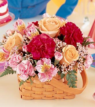 This rustic bouquet overflowing with flowers comes in a genuine wicker basket.