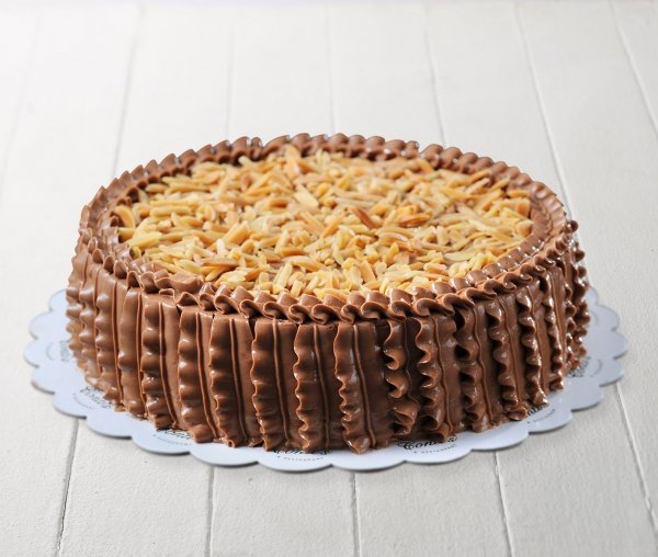 Layers of thin wafer coated with chocolate butter icing topped with roasted almond sticks Size: 8 � inches