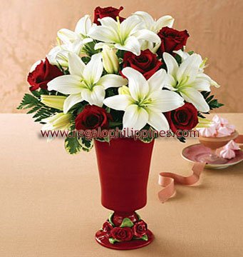 Six large fresh red rose with white Lilies. All garden fresh. Your vase is included!