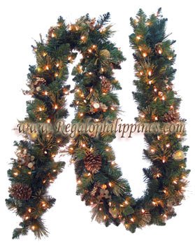 9' Harvest Gold Garland with Pine Cones, Leaves, Apples and Pears, 150 Clear Lamps.