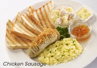 Flavorful homemade sausage with caramelized onion served with scrambled egg, toast, mango jam butter and chicken potato salad.