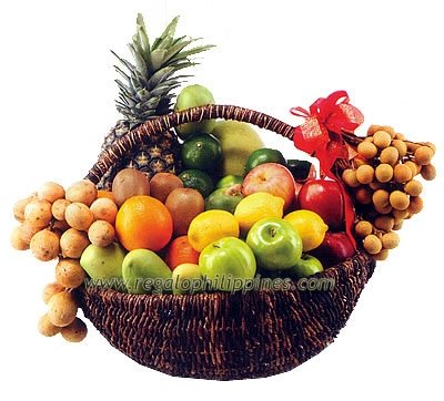 This fruit basket contains fresh and delicious fruits: Pineapple, Lemon, Apple, Papaya, Lanzones, Dalandan and