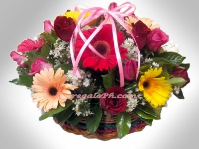 A magnificent blend of rich heritage and classic influence makes up this extravagant basket of fresh Roses, Gerbera, fillers asters and green leaves.