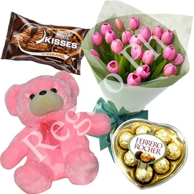 Blooms this beautiful 1 dozen tulip, hersheys chocolates,ferrero heart & 18inches stuff toys. This tantalizing friendship combo in soft spring colors of tulips make a thrilling thank you gift or sweet and innocent reminder of your love or friendship.