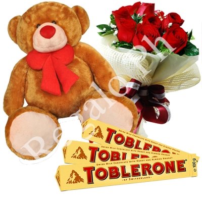 Turn up the heat on a new romance - or a lifelong love affair - with this classic composition. It features 6pcs red rose in a bouquet, approximately 4ft stuff toys & 300g of toblerone chocolates.
