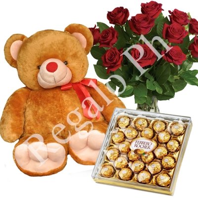 Love's divine, this beautiful arrangement feature of 1dozen red roses in a vase with approximately 4fth stuff toys & 24ferrero chocolates is a timeless gift for your beloved.