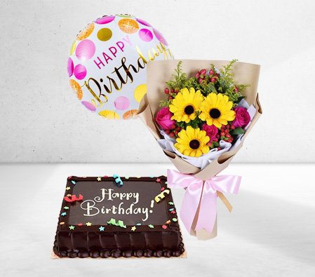 Something special for someone Special this combo gifts comes with 4 stems of pink and yellow stargaizer, 5 pcs lytex balloons, and a regular size cake from goldilocks