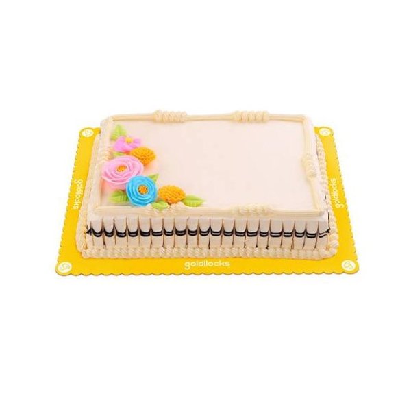 Moist vanilla and choco marble cake with vanilla frosting topped with colorful candy flowers. Good for 18
