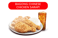 2pcs of Crunchier, Juicier, All-new Chinese Sarap Fried Chicken paired with Gravy and served with Rice, Chicharap and Drink.