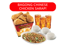 Composed of 6pcs Chinese-style Fried Chicken, 3 cups of rice, 3 regular drinks, and 1 serving of Pancit. Good for 4pax