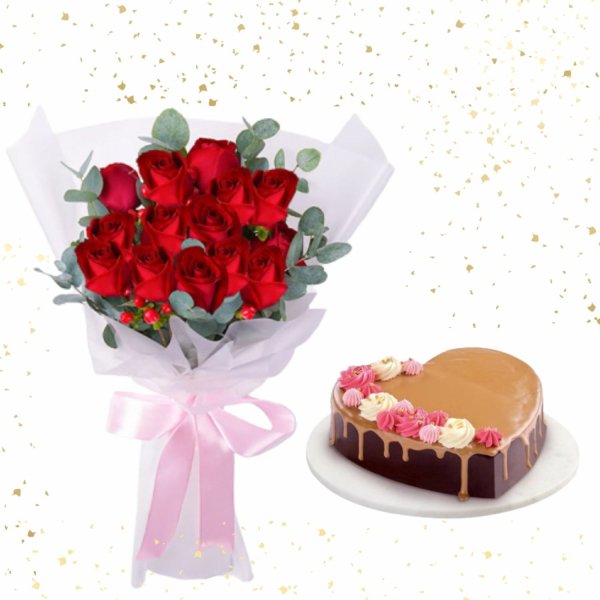 12 Red Roses Bouquet with Goldilock Choco Caramel Valentine Cake
