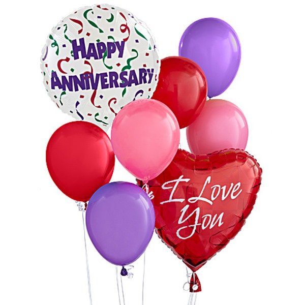 A set of Balloons that includes a Happy Anniversary and I love you mylar balloon.