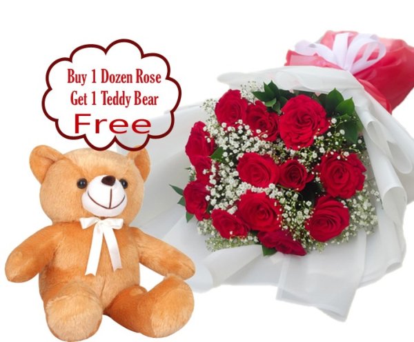 Get this exclusive promo for Valentine's Day, 12 stems of Red Roses with fillers Bouquet then automatic you will have 1 FREE Teddy Bear.
