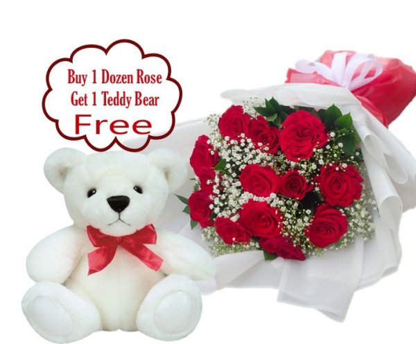 Get this exclusive promo for Valentine's Day, 12 stems of Red Roses with fillers Bouquet then automatic you will have 1 FREE Teddy Bear.