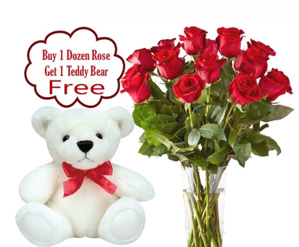 Get this exclusive promo for Valentine's Day, 12 stems of Red Roses in a Vase then automatic you will have 1 FREE Teddy Bear.