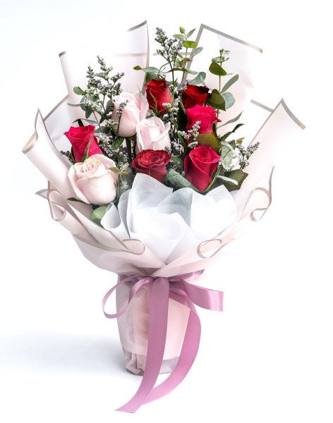3 become 1 arrangement. 3 stems Red Roses + 3 stems Light Pink Roses + 3 stems Dark Pink Roses.