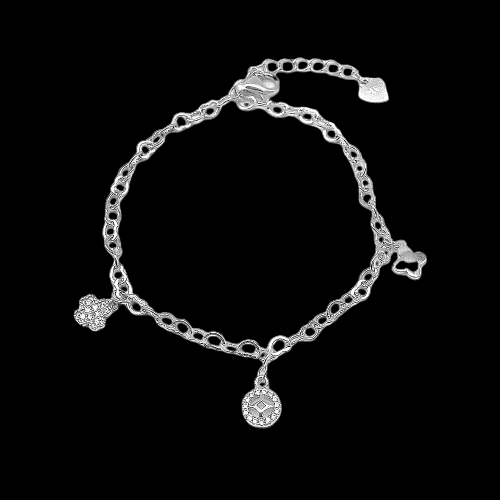 A perfect playful accessory for those days out. Corazon is a sterling silver bracelet with clover shape charms and zirconia stones. A gift that will surely capture the heart of your special one. [Stock Number: B5046]