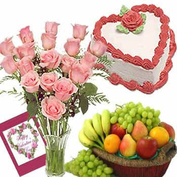 twelve stems of pink roses in a clear glass vase with round shape 500 gms available cake and two kgs of mixed fruits in a basket with one valentine card is perfect to confess your valentine to stay in your heart for whole life.