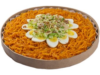 Dencio's take on a pinoy favorite pancit with its special palabok sauce topped with fried garlic bits, freshly chopped spring onions, pork sisig & slices of boiled eggs.