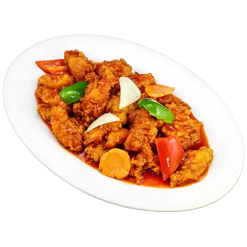 Battered fish fillet, fried and smothered with Chinese style sweet & sour sauce