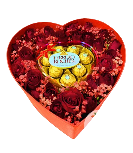 A Romantic Heart Box which includes 24 Stems Red Roses and 8's Heart Ferrero Rocher Chocolate with Seasonal Fillers.